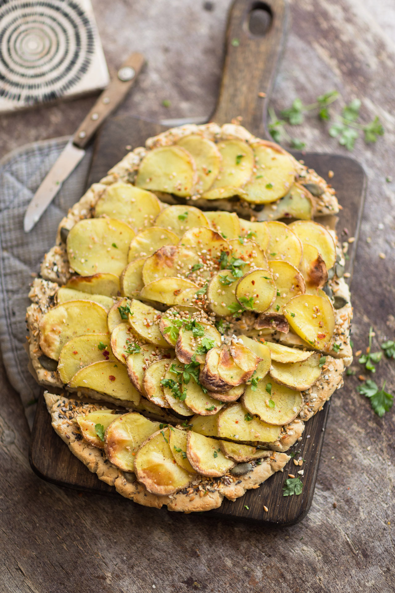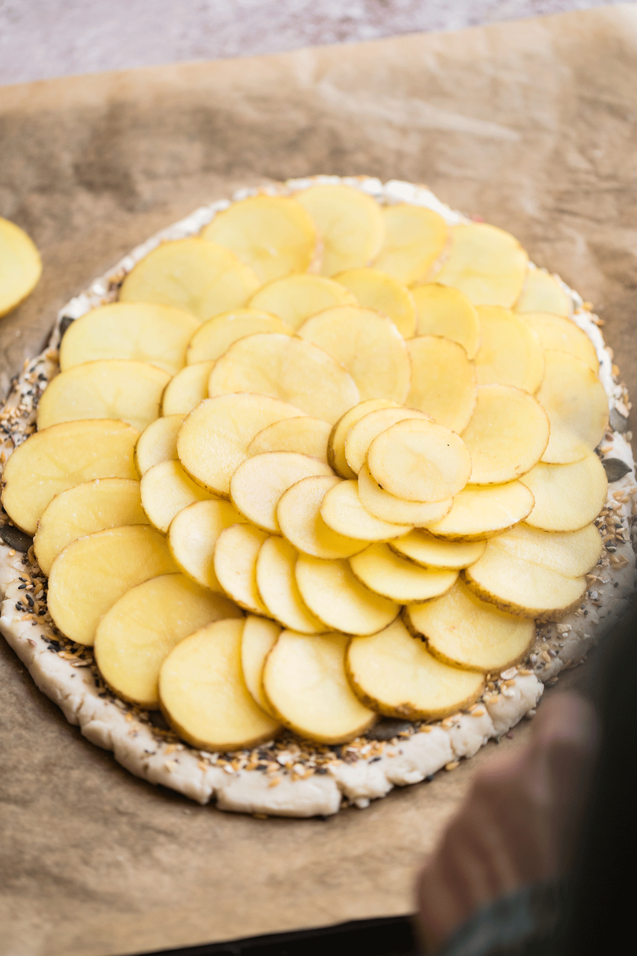 Normalerweise belegt man seinen Pizzateig mit Tomatensoße und weiterem Gemüse. Ja, normalerweise. Wir gehen noch einen Schritt weiter und neben fein geschnittene Kartoffelscheiben. Ich übertreibe nicht, wenn ich sage dass das mit Abstand beste Pizzabelag ist den ihr je gegessen habt.