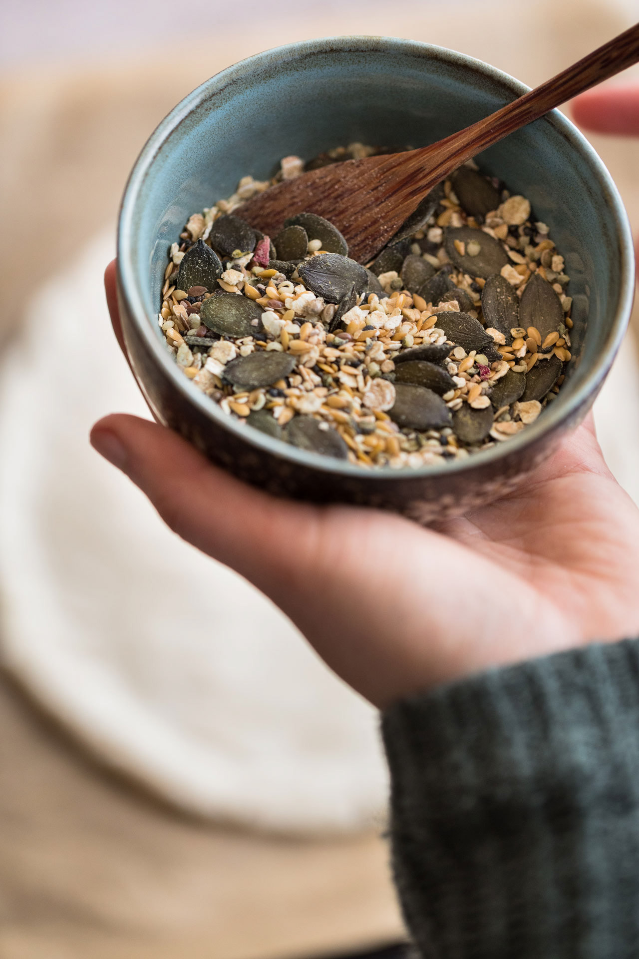 Ach und für den extra Crunch, habe ich auf den Boden noch eine Körner Mischung aus Kürbiskernen, Leinsamen, Chia Samen, Sesam, Haferflocken und Hefeflocken verteilt! So so gut.