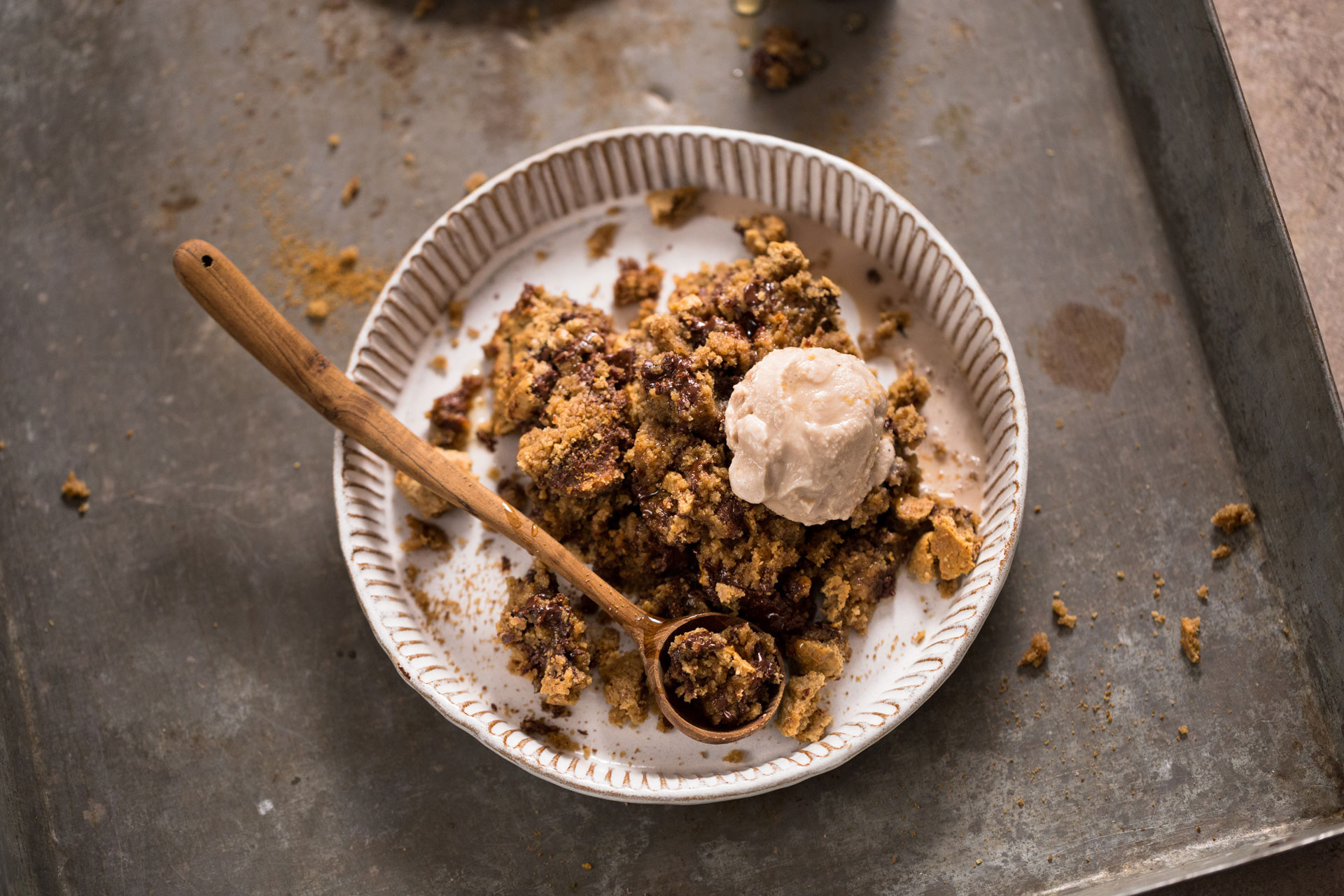 Beim Zuschneiden der eigentlichen Brownies war ich aber (mal wieder!) viel zu ungeduldig und es lösten sich ziemlich viele Stücke und aus reiner Verzweiflung nahm ich den größten Löffel und schöpfte mir einfach das eigentliche Stück auf meinen Teller. Was soll ich sagen, so entstand dann der Chocolate Chip Brownie Crumble!