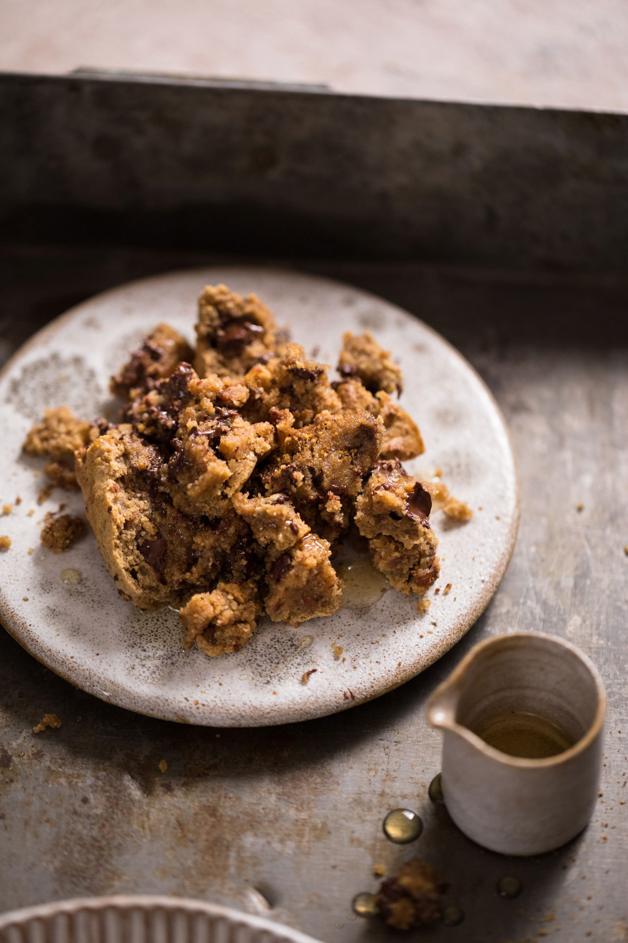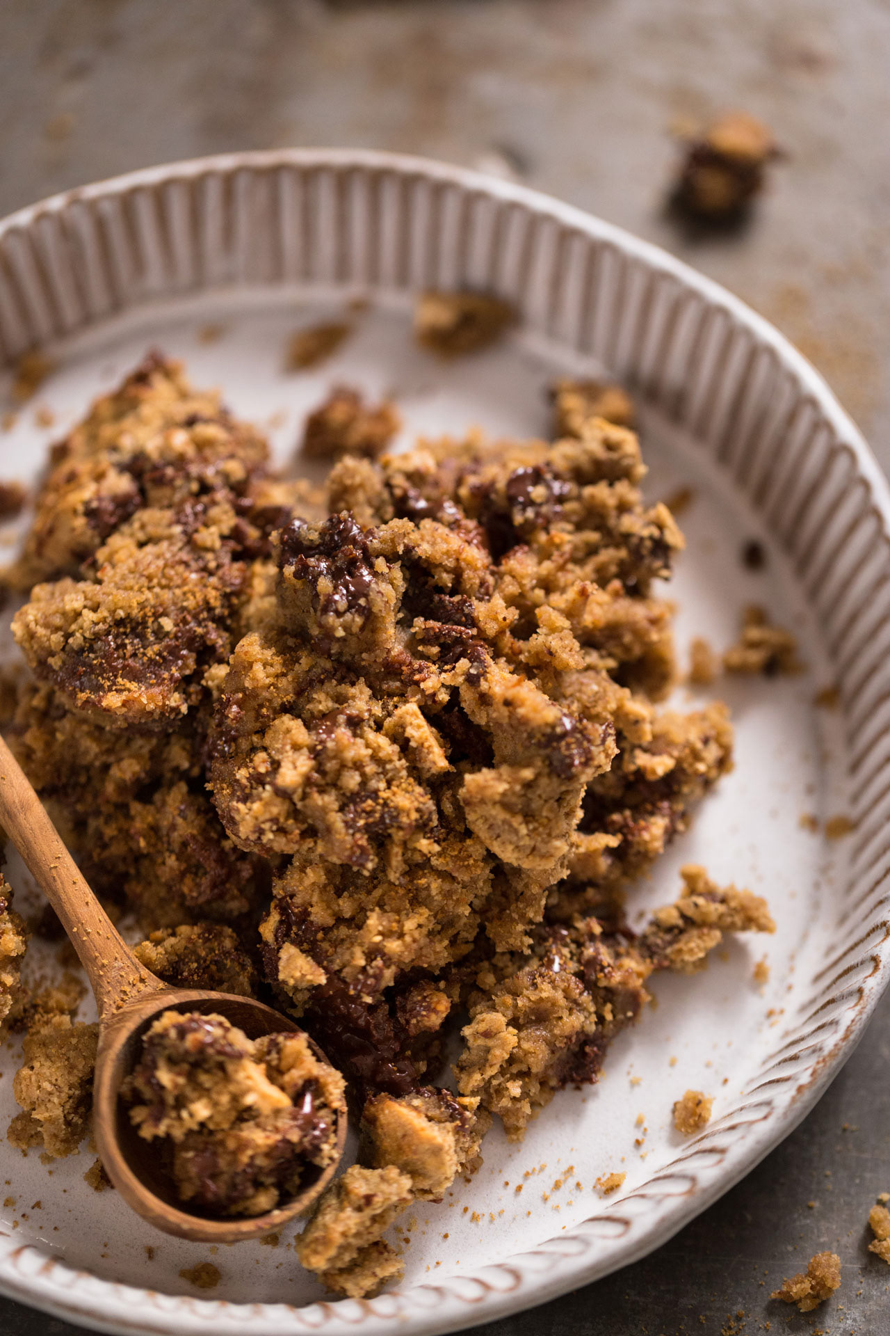 When cutting the actual brownies I was (well again!) way too impatient and it solved a lot of pieces and out of desperation I took the biggest spoon and just scooped it all out. What can I say, then came the Chocolate Chip Brownie Crumble!
