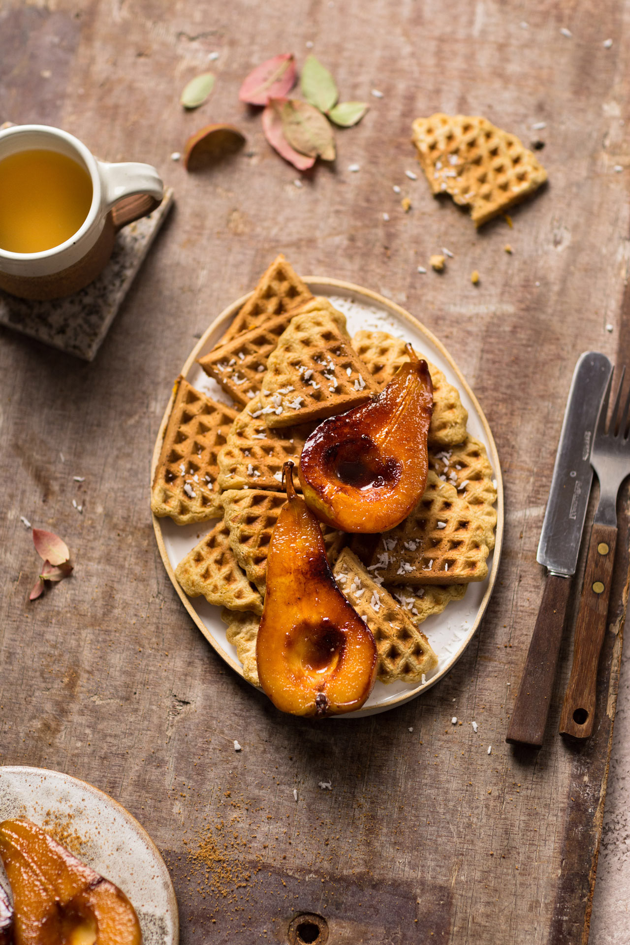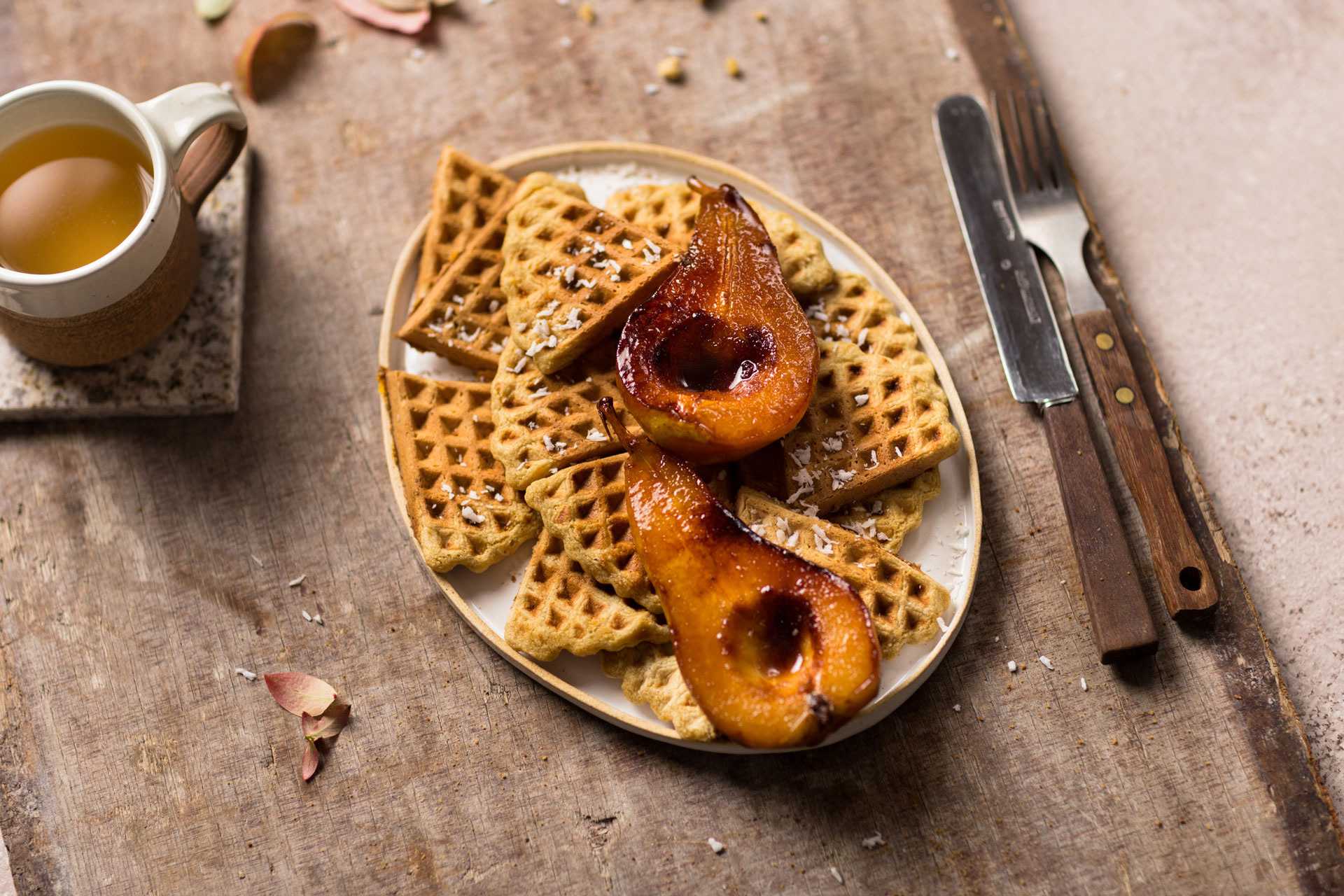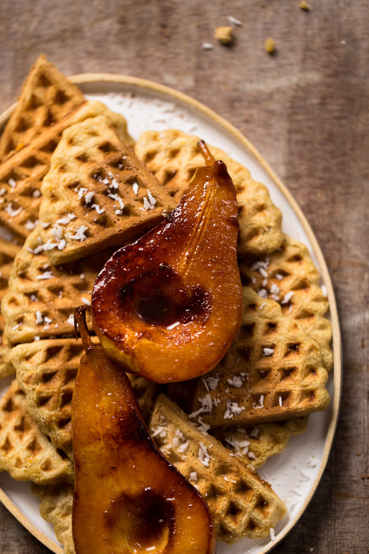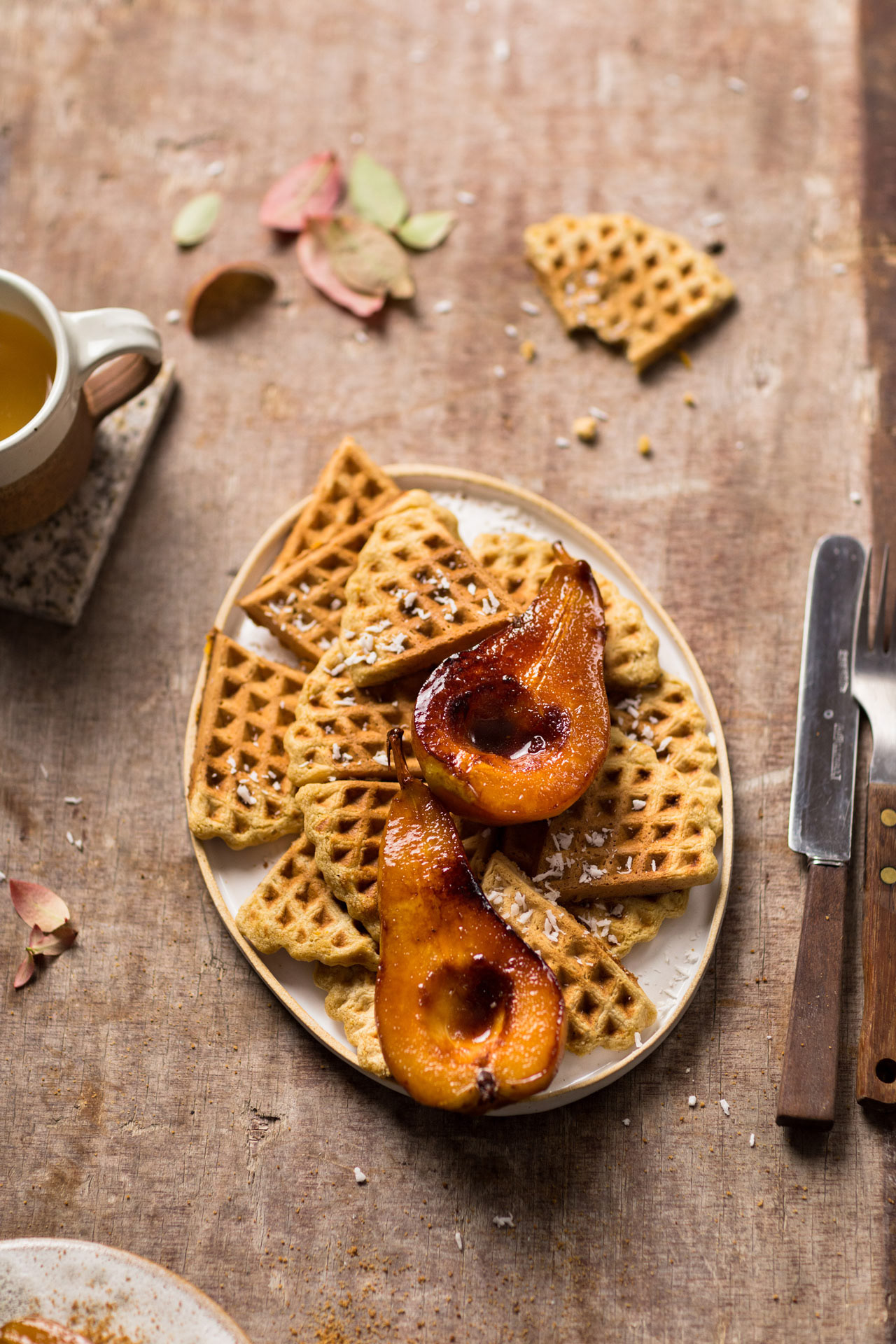 In addition to the waffles but also a fruity, sweet component may not be missing. Exactly, braised pears! Oh, how I love that. Whether to eat them with these waffles, even cereal or just simple the pear, that's one of the quintessential autumns for me.As a little tip: the pears are peeled and then stewed in a pan. In the meantime, you can put tea from the skin of the pear. So you do not need to throw it away.