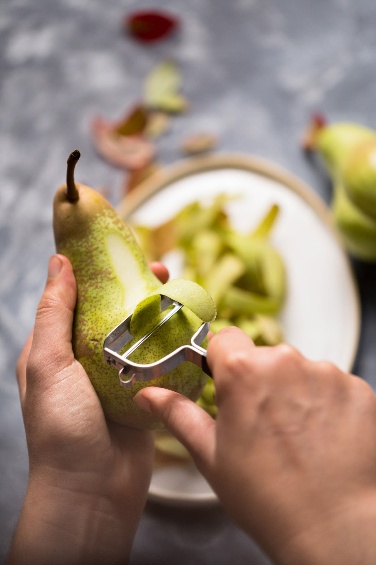 Als kleiner Tipp: die Birnen werden geschält und schmoren dann in einer Pfanne. In der Zwischenzeit könnt ihr aus der Schale der Birne Tee aufsetzten. So braucht ihr nichts davon wegschmeißen.