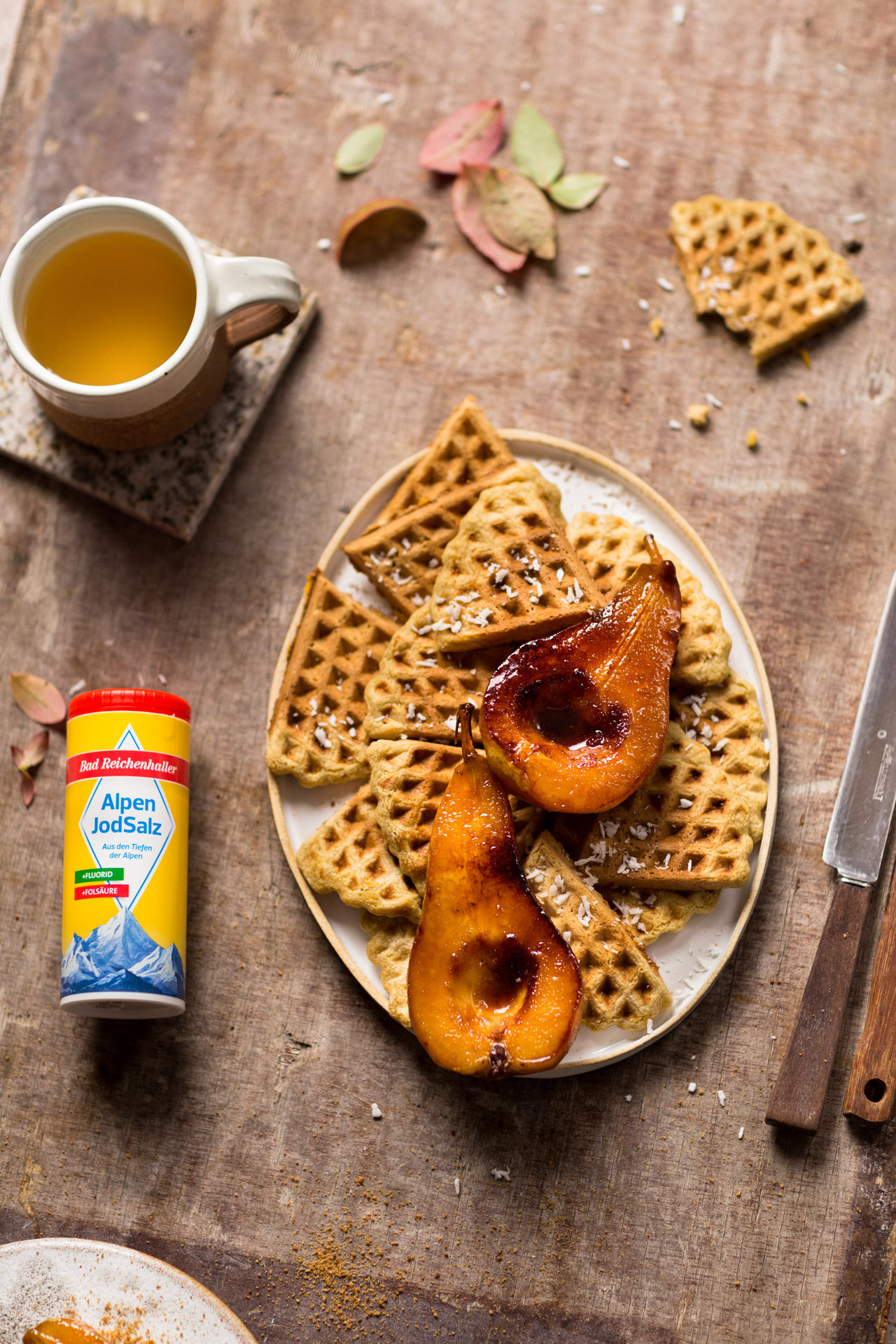 Now back to the waffles. They are so delicious because you can hardly eat a single one. In addition to pumpkin, oat flour, vanilla, applesauce, maple syrup and a pinch of salt from Bad Reichenhaller are also to be found! Thus, they are not only gluten-free, but also work very well without refined sugar. Sure, if you like something sweeter, you can add a little more maple syrup.