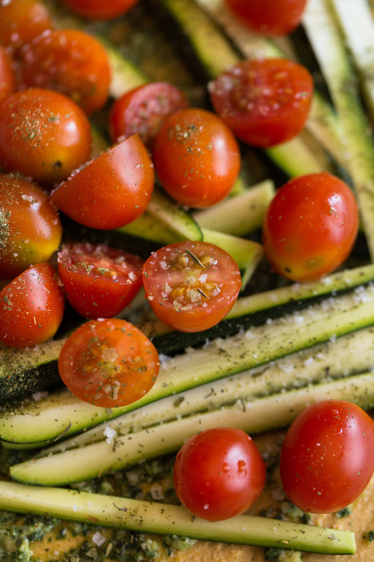 Due to the extreme heat is well, not only my own basil literally exploded and now almost 60 cm, but also the mint at my parents house. They were thrilled when I asked to get some for the pesto. Which leads me to the topping of this recipe, homemade pesto!