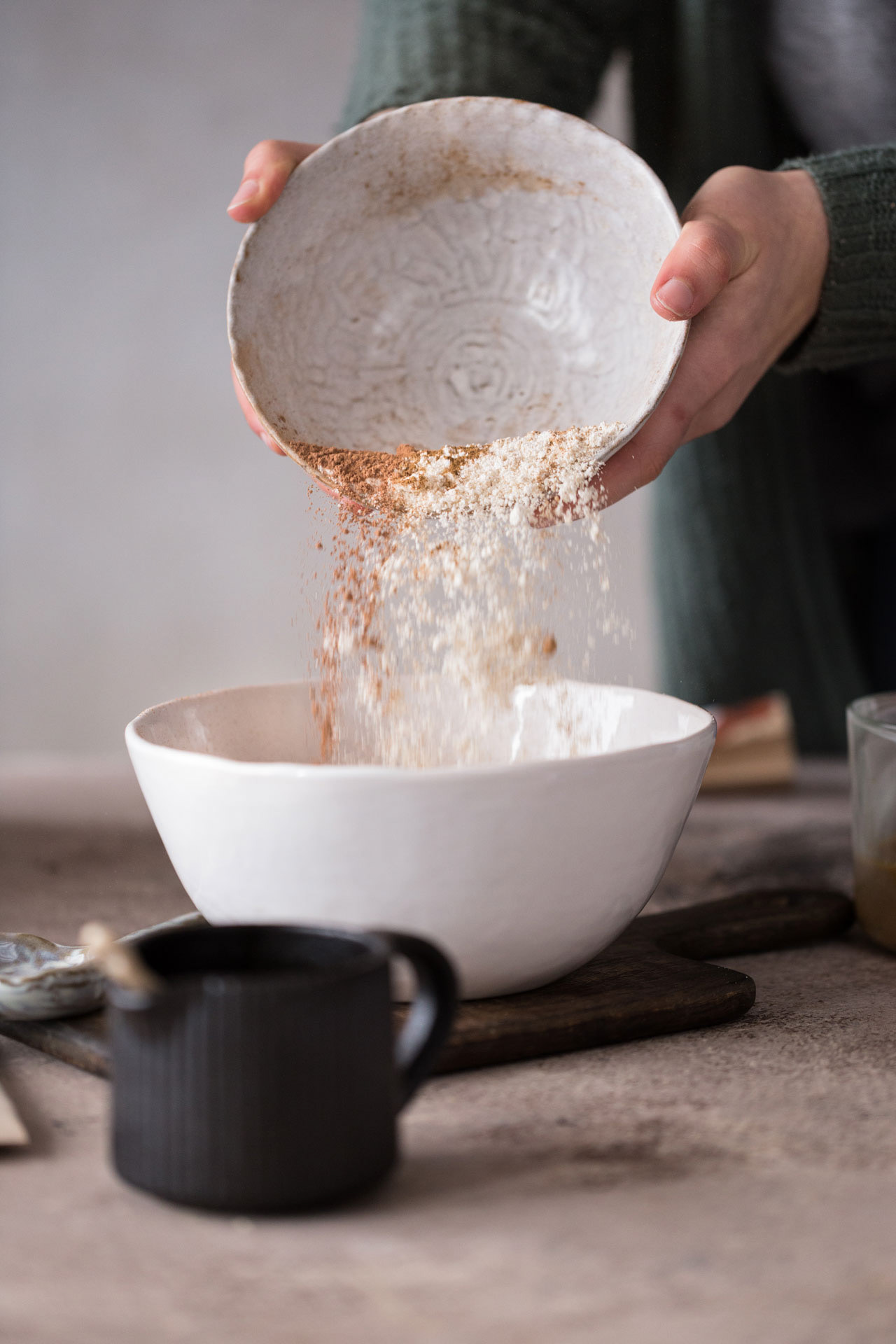 Dabei rauskommen diese veganen, glutenfreien Kakao-Vanille Pancakes die auch nur aus einer Handvoll Zutaten bestehen, wie Haferflocken, Erdnussbutter, Agavendicksaft, Zimt, Flohsamenschalen und natürlich den aufgebrühten Tee.