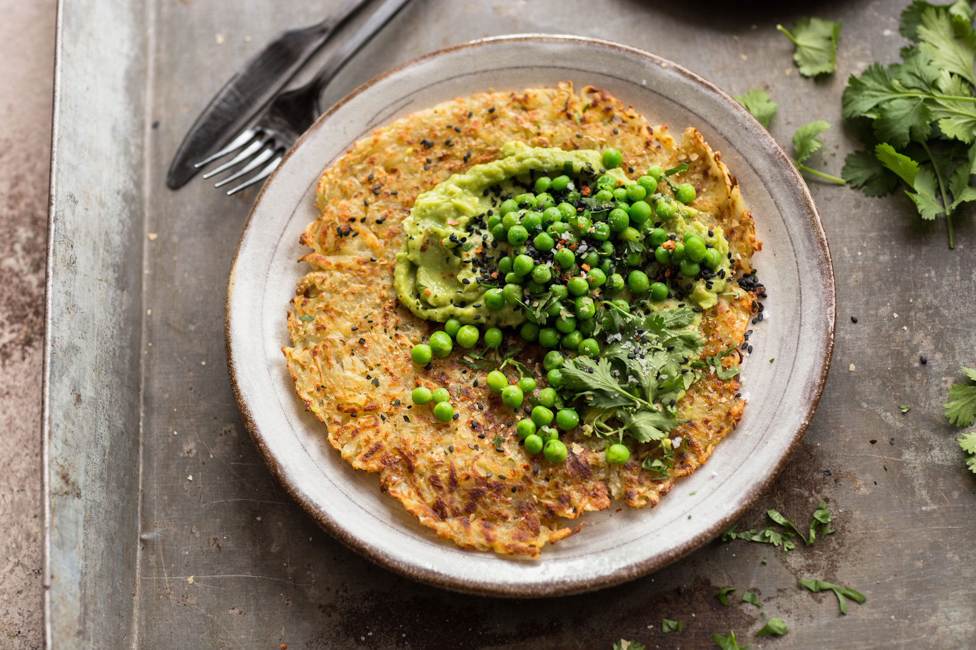 Nothing beats an uncomplicated dinner! Like this potato pancake with an avocado pea cream.