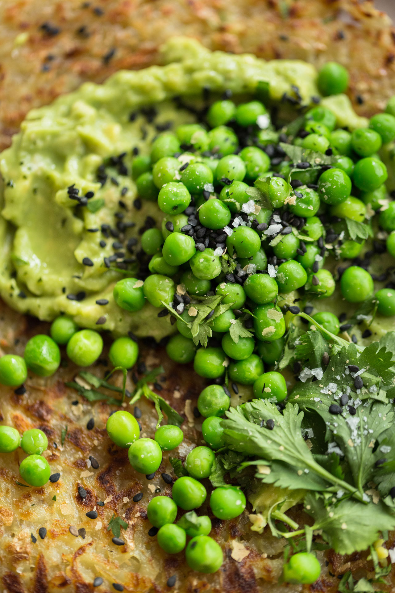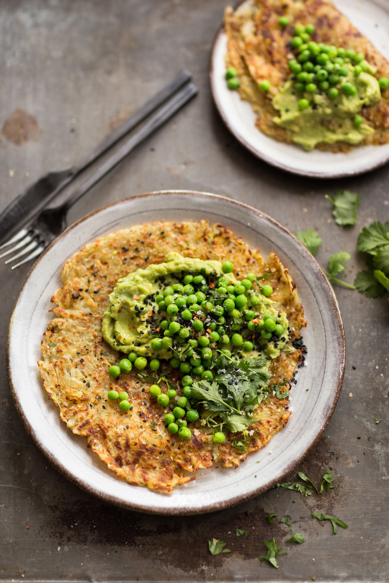 Nichts geht über ein unkompliziertes Abendessen! Wie diese Kartoffelpuffer mit einer Avocado-Erbsen Creme.