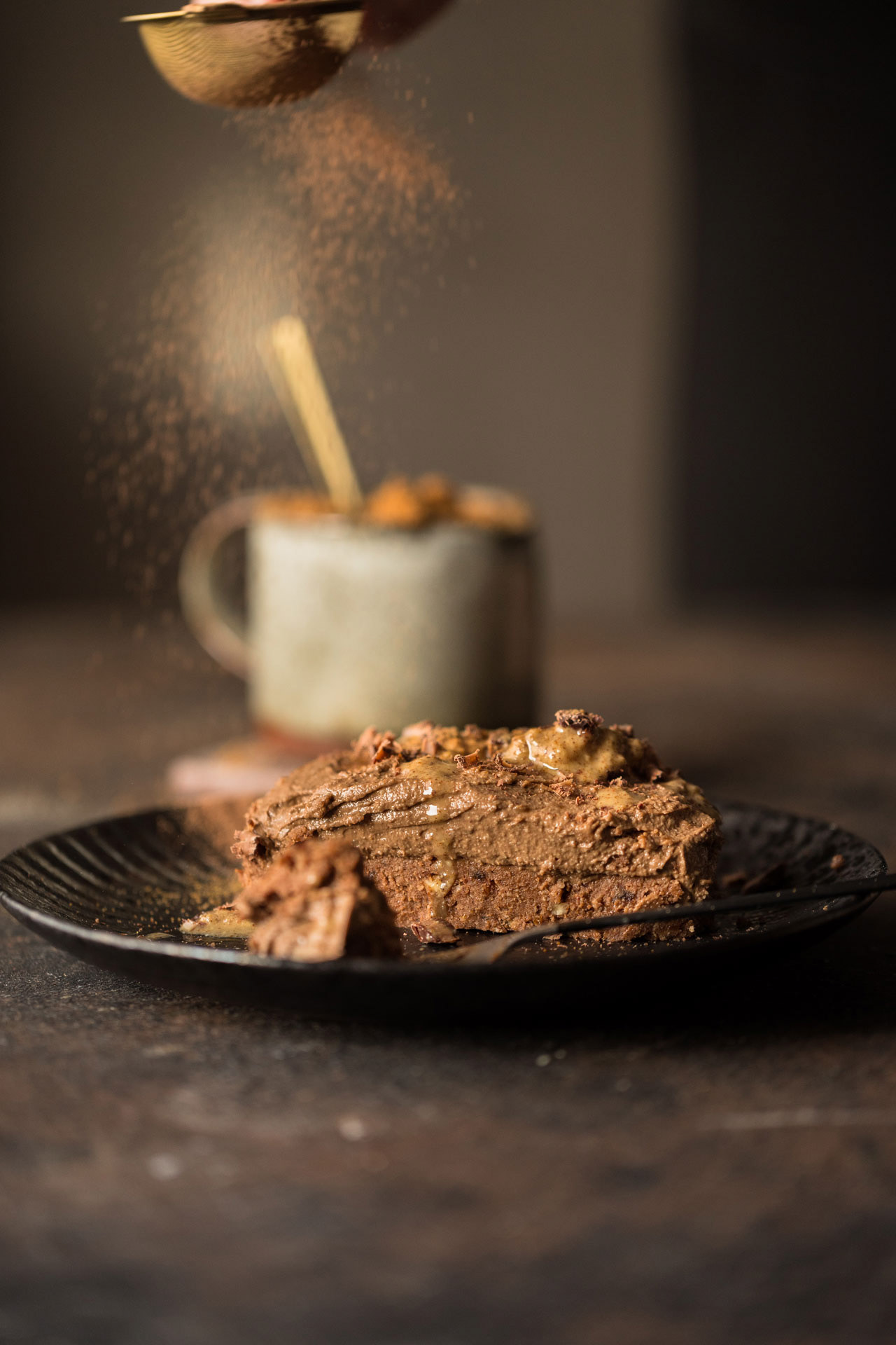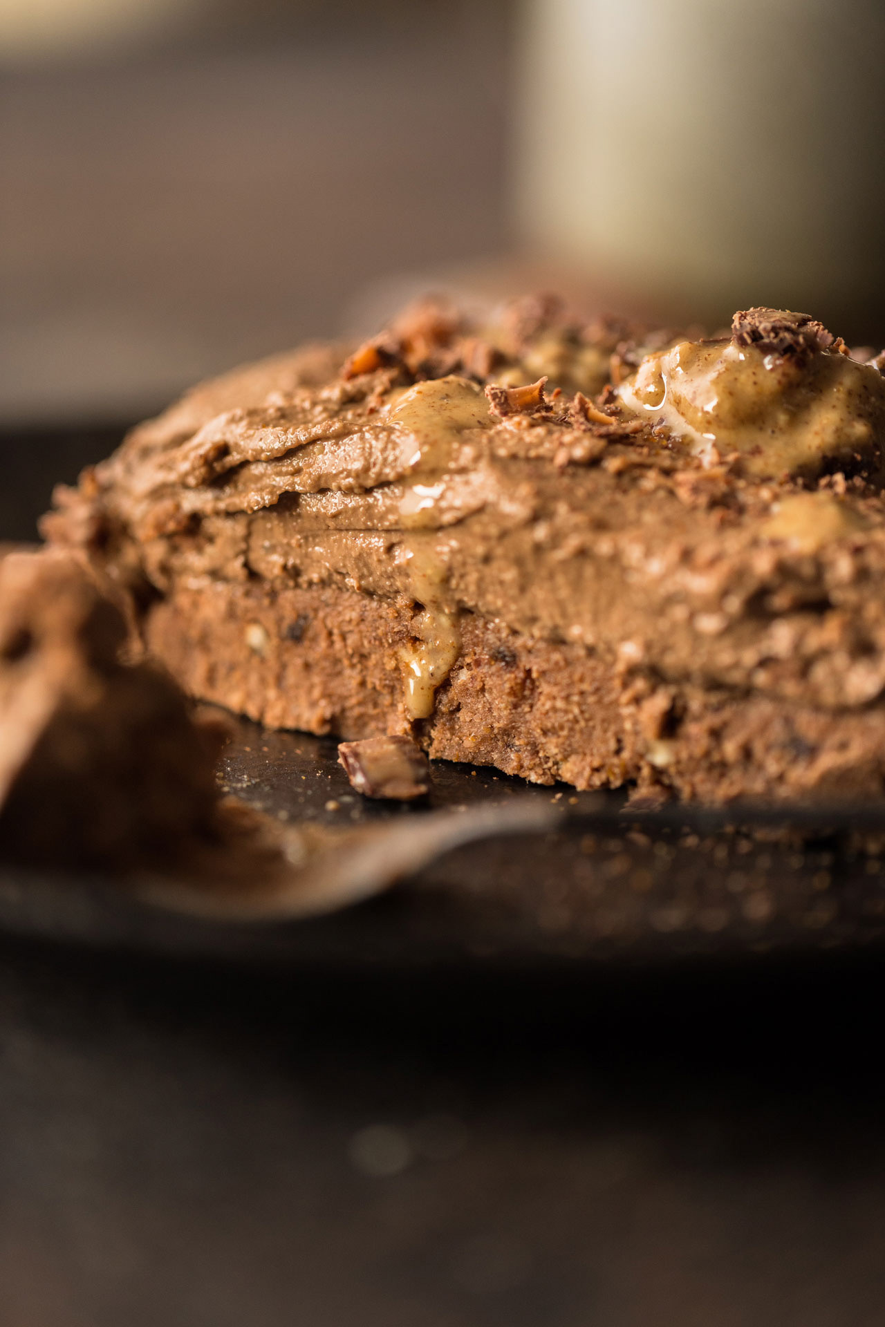 Was es jetzt braucht ist ein roher Schokoladen Kuchen. Ganz besonders dieser hier. Bei jedem Biss erinnert er einen an einen fluffigen Brownie, Kakao Smoothie und eine kleine Sünde die nur aus den besten Zutaten besteht.