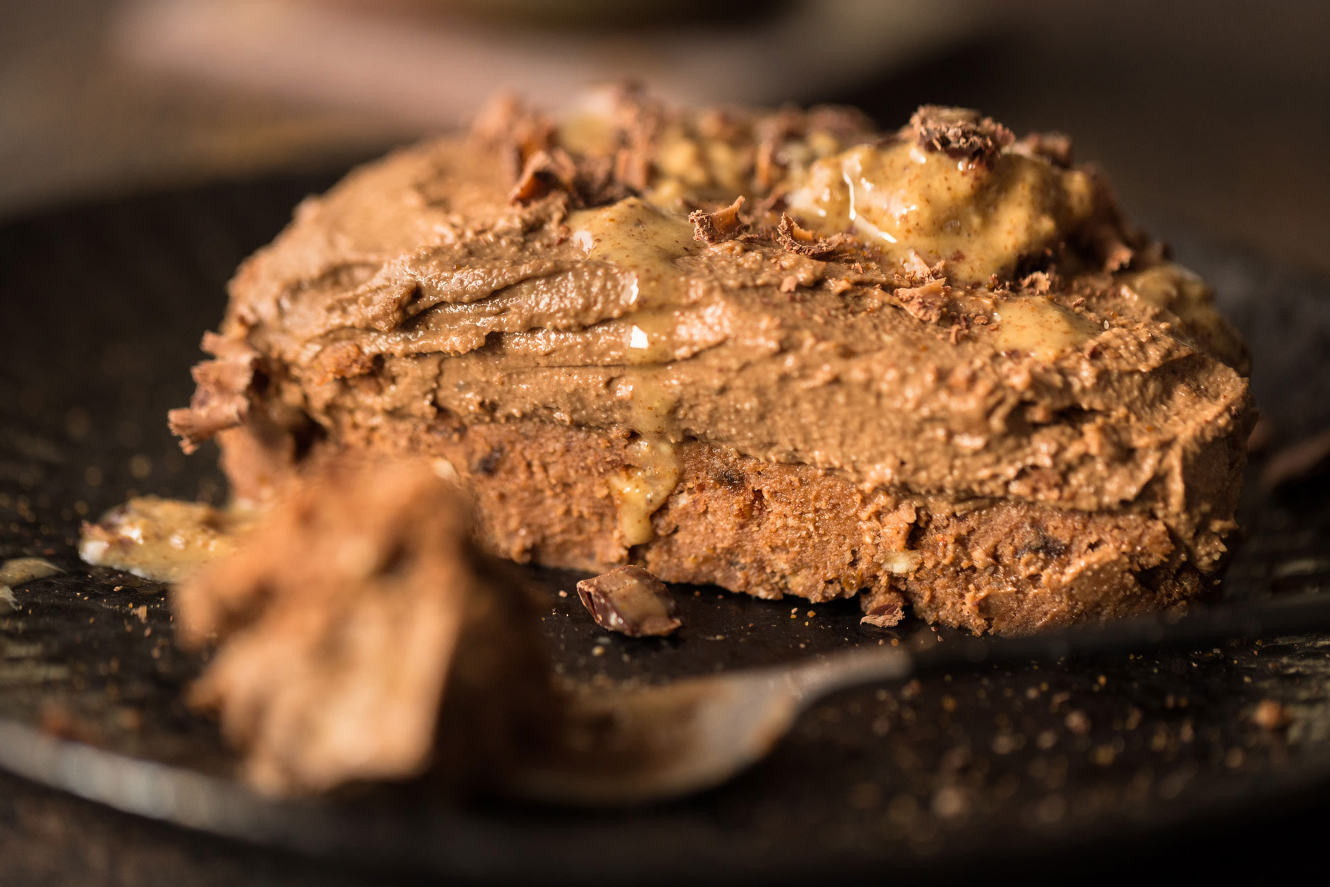 Nach mehreren Minuten abkühlen, ich mag den Kuchen tatsächlich nicht besondern wenn er so stark eingefroren ist, mit Mandelmus, geraspelter Schokolade und etwas Kakaopulver genießen. Das war’s auch schon!