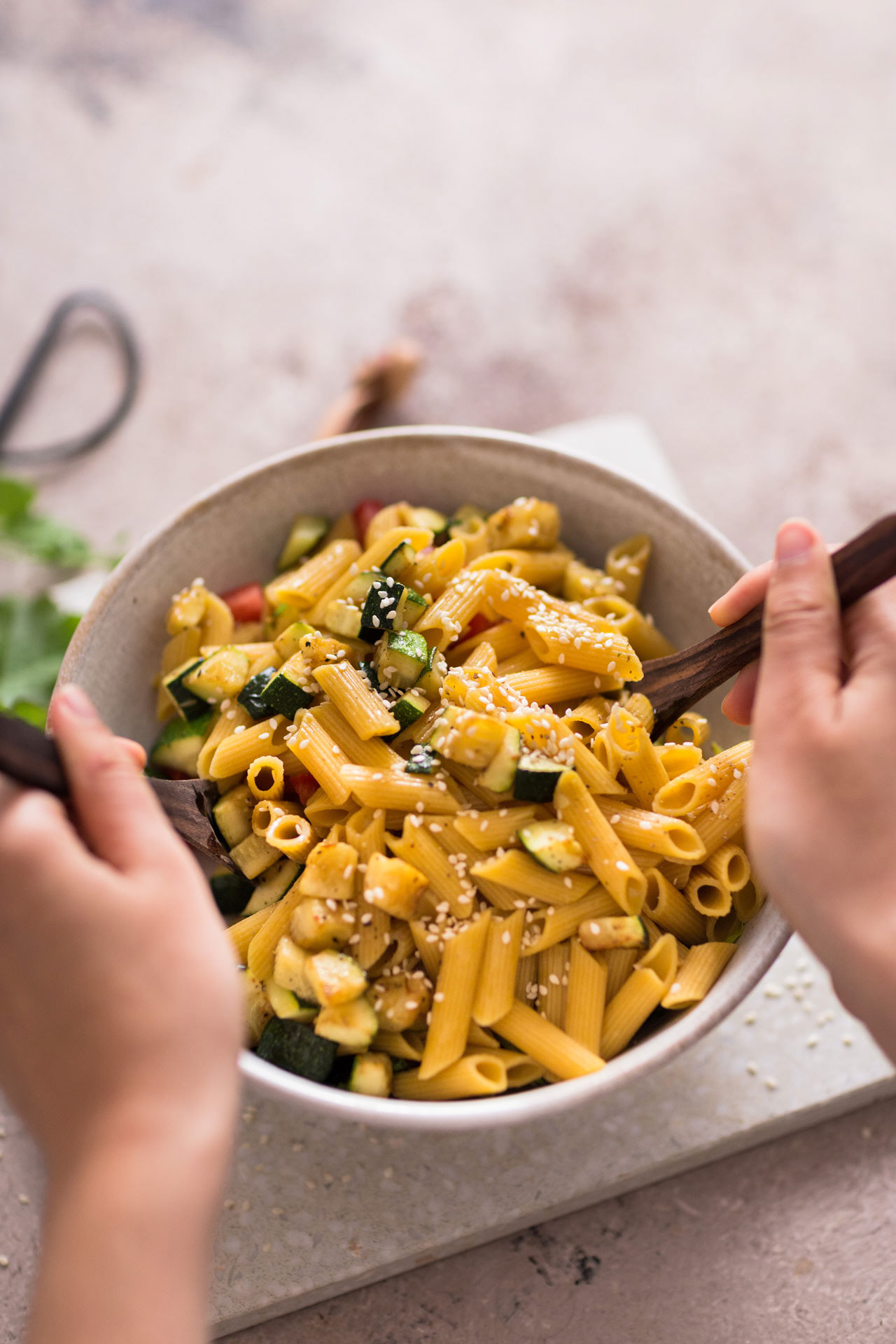 Wenn es nach mir geht, dann könnte ich bei den warmen Temperaturen diesen sommerlichen lauwarmen Nudelsalat tatsächlich jeden Tag essen.