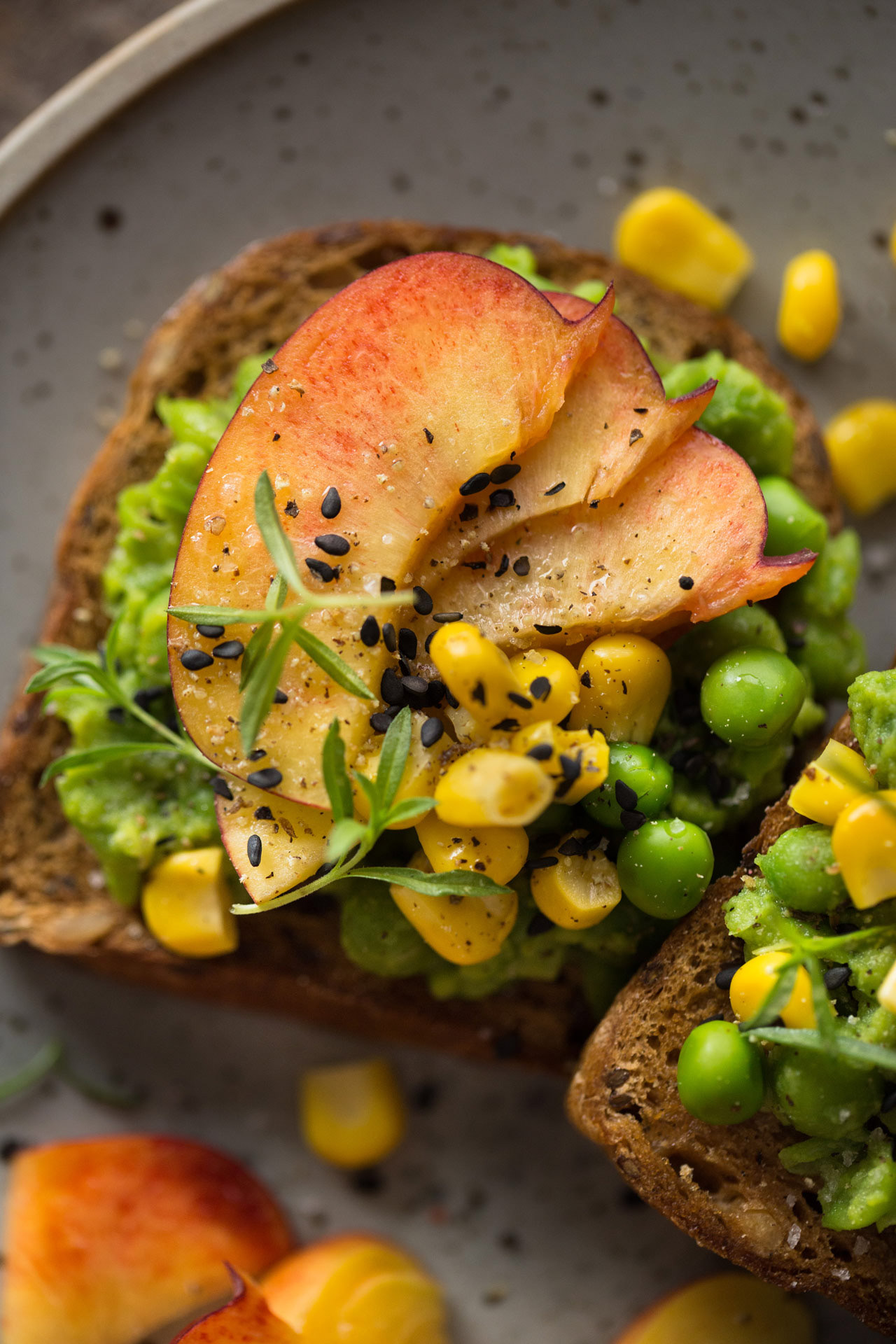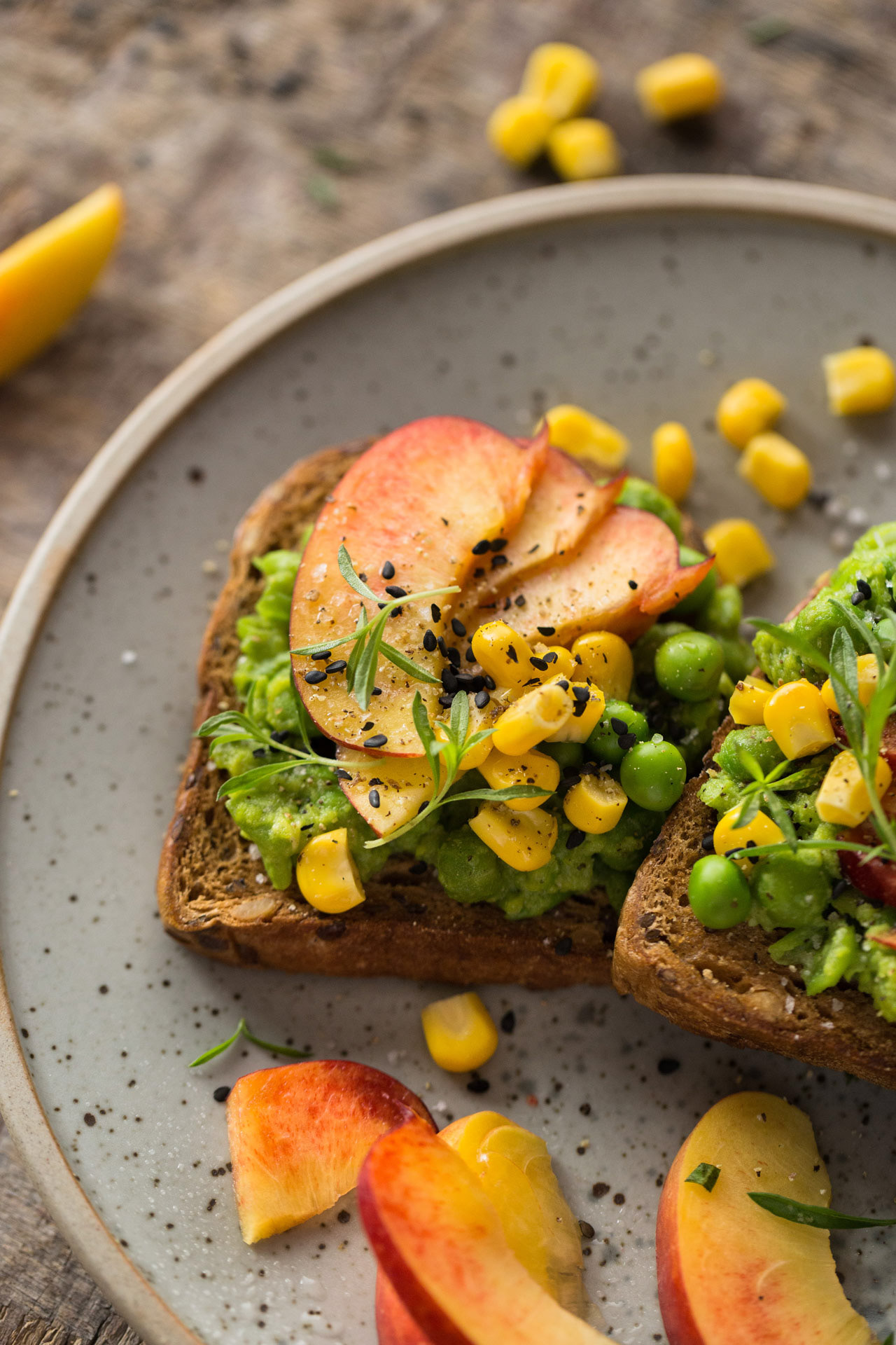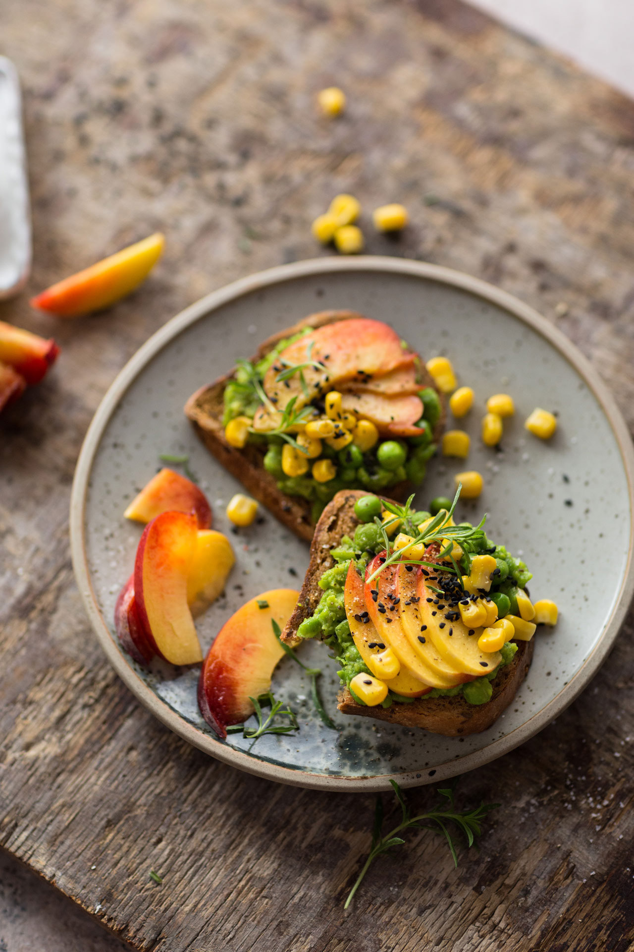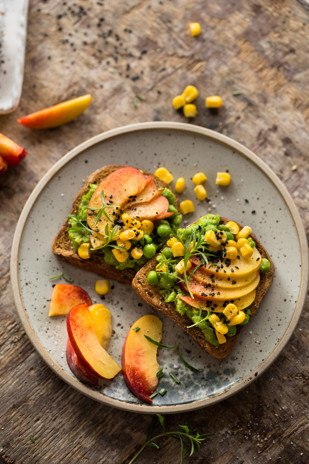 Here you will find slightly crispy toast with a super creamy peas puree, nectarines and corn. Yes, at first glance, the combination sounds very, very strange. But it tastes so good, in my opinion, totally after summer!