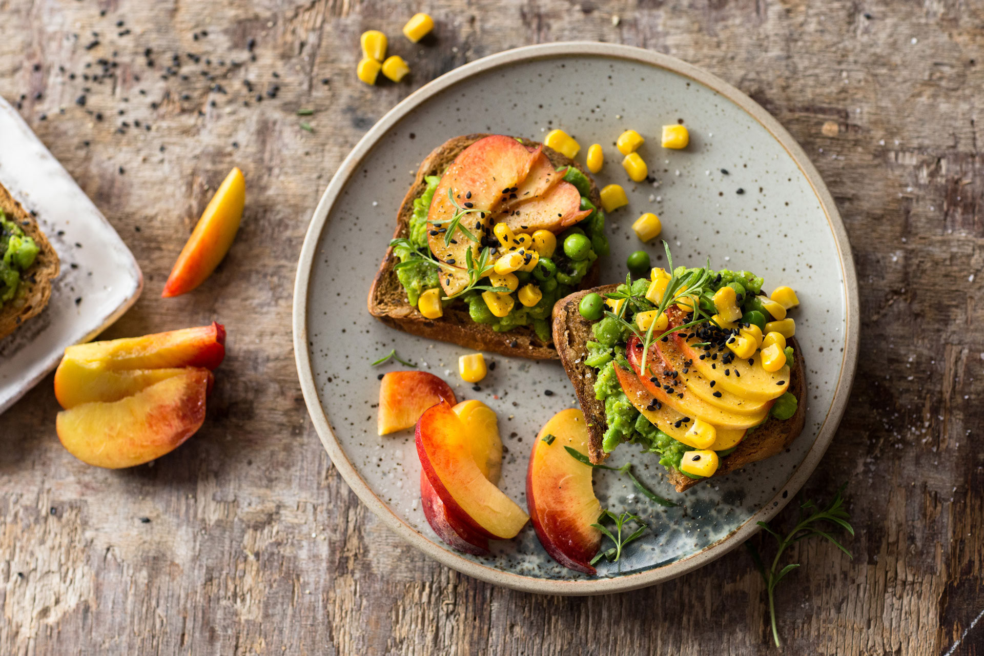 Hier findest ihr leicht krosses Toastbrot mit einem super cremigen Erbsen Püree und dazu Nektarinen und auch noch Mais. Ja, auf den ersten Blick klingt die Kombination erstmal sehr, sehr komisch. Sie schmeckt aber. meiner Meinung nach, total nach Sommer!