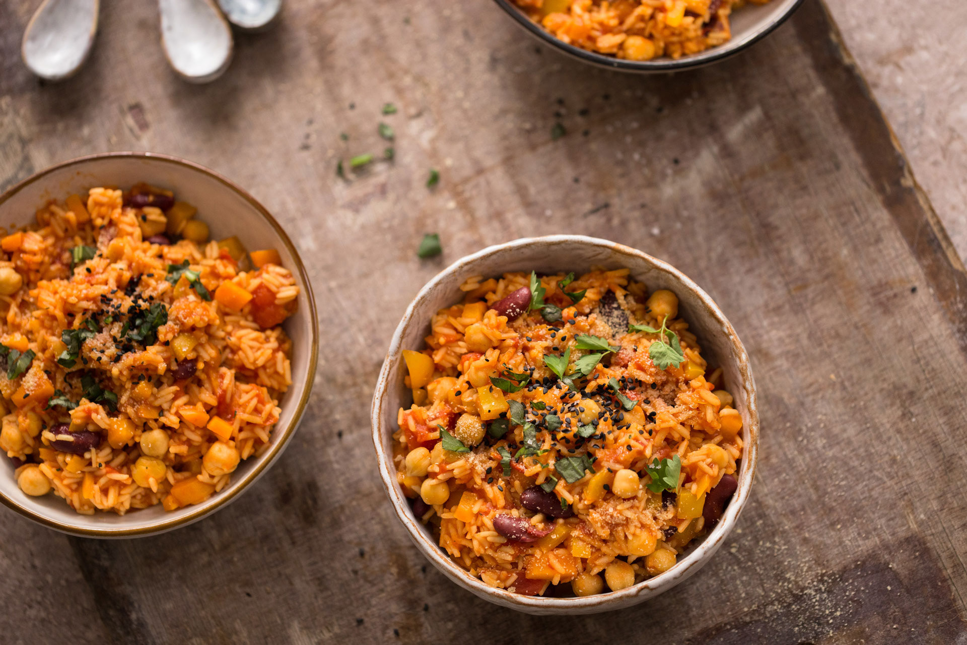 So, this is a rice dish. Personally, it reminds me of a mix of one pot pasta and paella. The special or much more, pretty good thing about it, everything is allowed and your fantasies have no limits. You do not like chickpeas, then leave them out or replace them with lentils. You still have broccoli or other vegetables in the fridge then just add it!