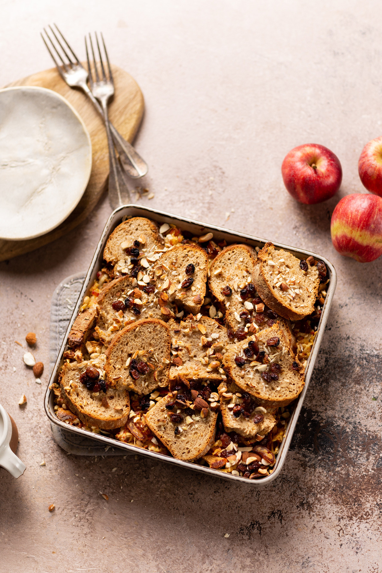 Außerdem findet man auf der ersten Schicht noch eine Handvoll an getrockneten Früchten, Datteln und Nüssen. Dann wird der Scheiterhaufen mit einer weiteren "Brot-Schicht" abgedeckt und kommt in den Backofen.