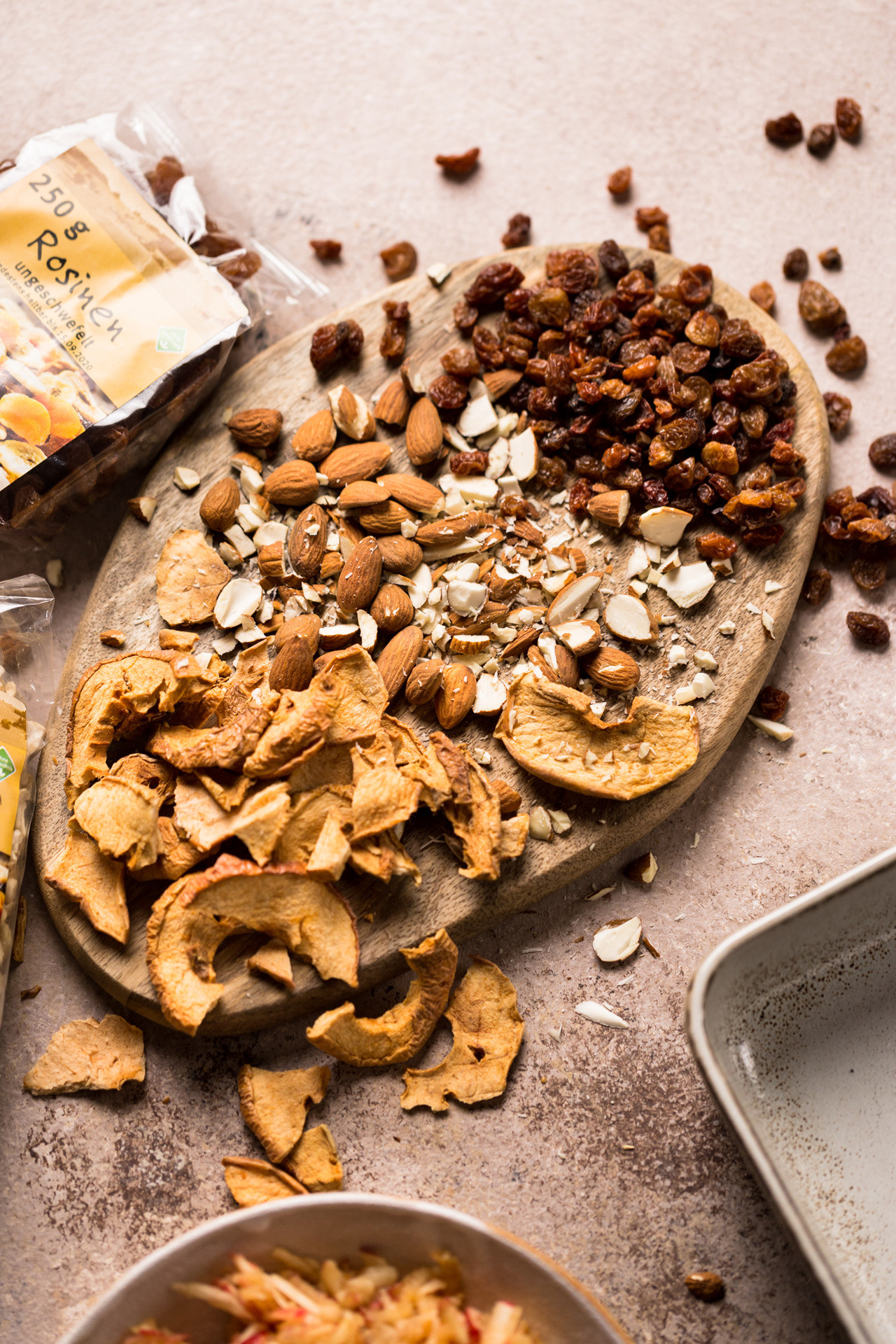 The older buns, bread or pastries from the previous day are dipped in a milk mixture and then it goes into a baking dish.From then on, your imagination is free. For example, I still had several wrinkled apples that I finely grated. Carrots or other seasonal fruit are also suitable here.There is also a handful of dried fruit, dates and nuts on the first layer. Then the funeral pyre is covered with another "bread layer" and goes into the oven.